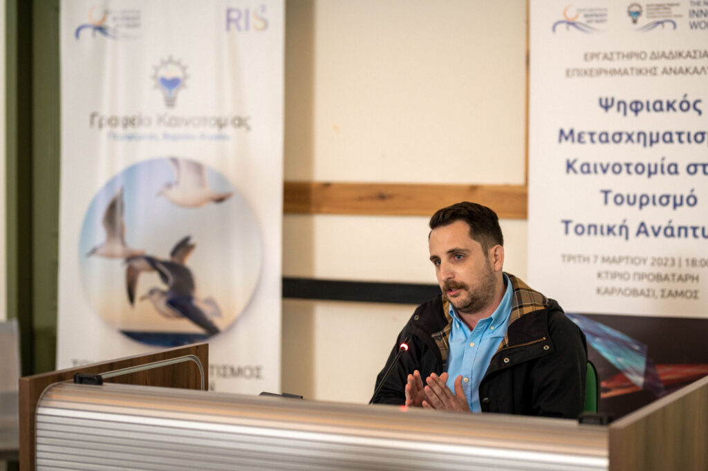 Την επόμενη μέρα, οι δράσεις του Γραφείου Καινοτομίας μεταφέρθηκαν στο φιλόξενο Κτίριο Προβατάρη του Πανεπιστημίου Αιγαίου στο Καρλόβασι, όπου πραγματοποιήθηκε το εργαστήριο με τίτλο «Ψηφιακός Μετασχηματισμός – Καινοτομία στον Τουρισμό – Τοπική Ανάπτυξη». Στο πρώτο μέρος, υπήρξε σύνδεση με την Διεθνή Έκθεση Τουρισμού στο Βερολίνο, με παρεμβάσεις της Διευθύντριας Τουρισμού της ΠΒΑ, Αγγελικής Πολυτάκη, και της κ. Παρασκευής Γλαρού από το Ikaria Activities, η οποία έκανε ειδική αναφορά στον ιαματικό τουρισμό. Στη συνέχεια, ο Καθηγητής, Γιάννης Χαραλαμπίδης, αναφέρθηκε στις ιδέες και τις πρωτοβουλίες του Πανεπιστημίου Αιγαίου για τον ψηφιακό μετασχηματισμό και την τοπική ανάπτυξη, ενώ ο Βασίλης Κρασσάς από την εταιρεία SoftOne στον Ψηφιακό Μετασχηματισμό των Μικρομεσαίων Επιχειρήσεων. Αξίζει να αναφερθεί, πως ο κ. Χαραλαμπίδης σημείωσε πως το Τμήμα Μηχανικών Πληροφοριακών και Επικοινωνιακών Συστημάτων του Πανεπιστημίου Αιγαίου είναι στη διάθεση των επιχειρήσεων του Βορείου Αιγαίου για να βοηθήσει στην πορεία ψηφιακού μετασχηματισμού τους.