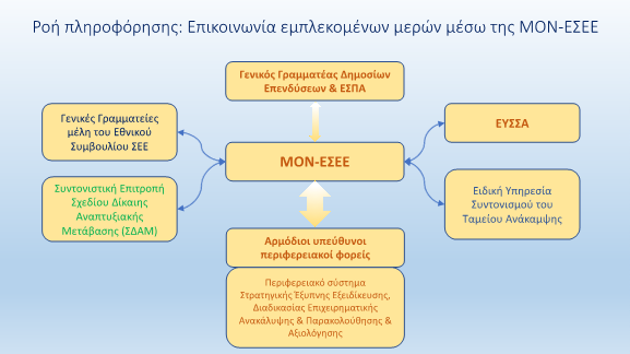 Στο παρακάτω σχήμα αποτυπώνεται η ροή της πληροφόρησης με σκοπό την αποτελεσματική παρακολούθηση και Αξιολόγηση των δράσεων σε εθνικό και περιφερειακό επίπεδο.